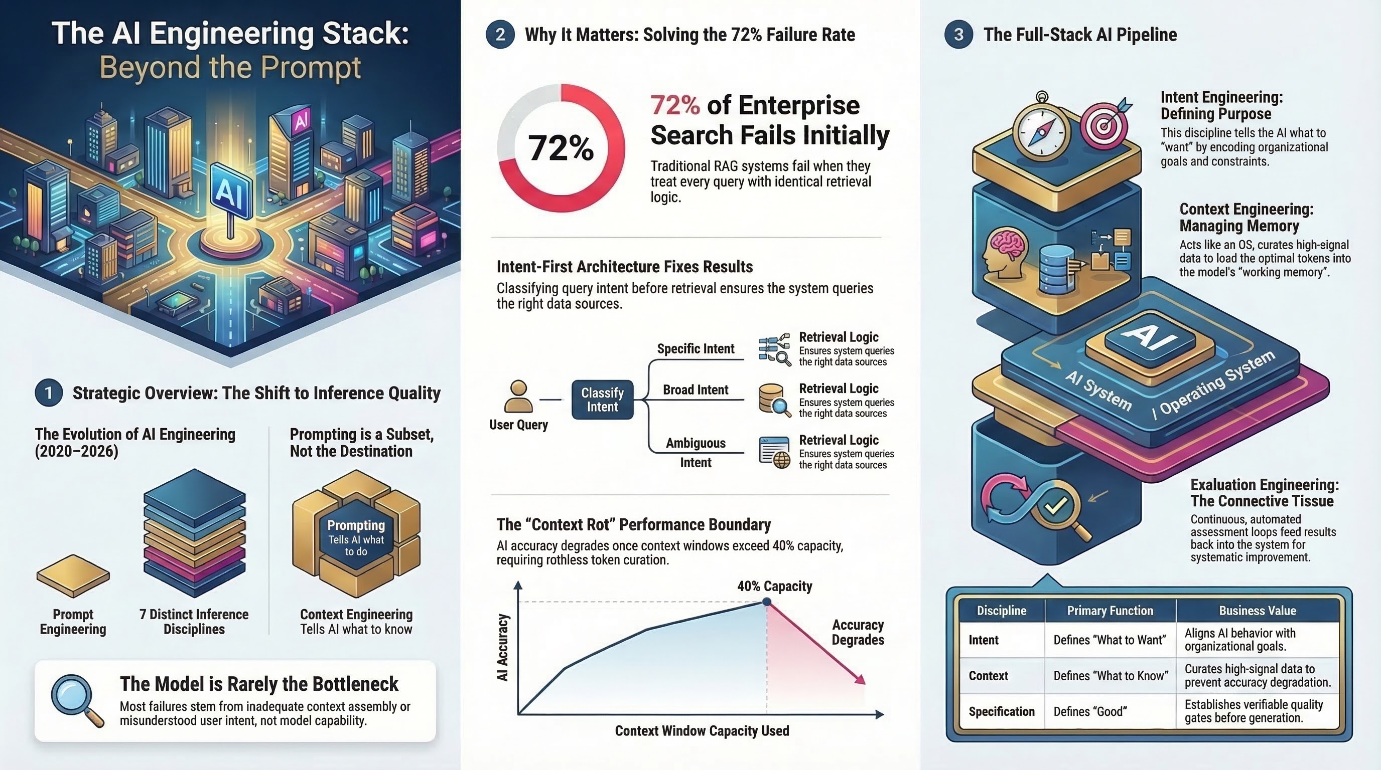 For enterprise search and RAG (retrieval-augmented generation, the pattern of feeding retrieved documents to a language model before it generates an answer), this matters directly. Coveo found that 72% of enterprise search queries fail to return meaningful results on the first attempt.[2] Most teams respond by tuning the model or rewriting the prompt. The research says the problem is more often in how context is assembled, how intent is classified, how specifications are enforced, and how outputs are evaluated. Fixing the prompt while ignoring the rest of the stack is like adjusting the seasoning on a dish made with spoiled ingredients.