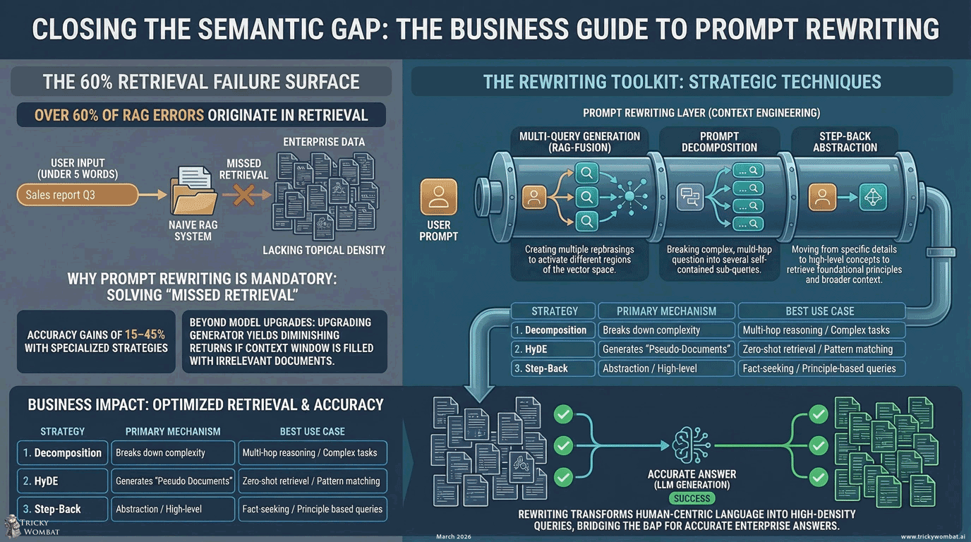 If your RAG pipeline passes the user's raw query straight to the vector database, retrieval quality depends entirely on how well the user phrases the question. Most users phrase questions in five words or fewer. Prompt rewriting closes the gap between how users ask and how documents are stored, before retrieval runs. Tricky Wombat's context engineering pipeline applies query reformulation, decomposition, and reranking as standard infrastructure, not afterthoughts. A 30-minute call will show where your retrieval stage is silently returning the wrong documents and what rewriting would change. Schedule a call.